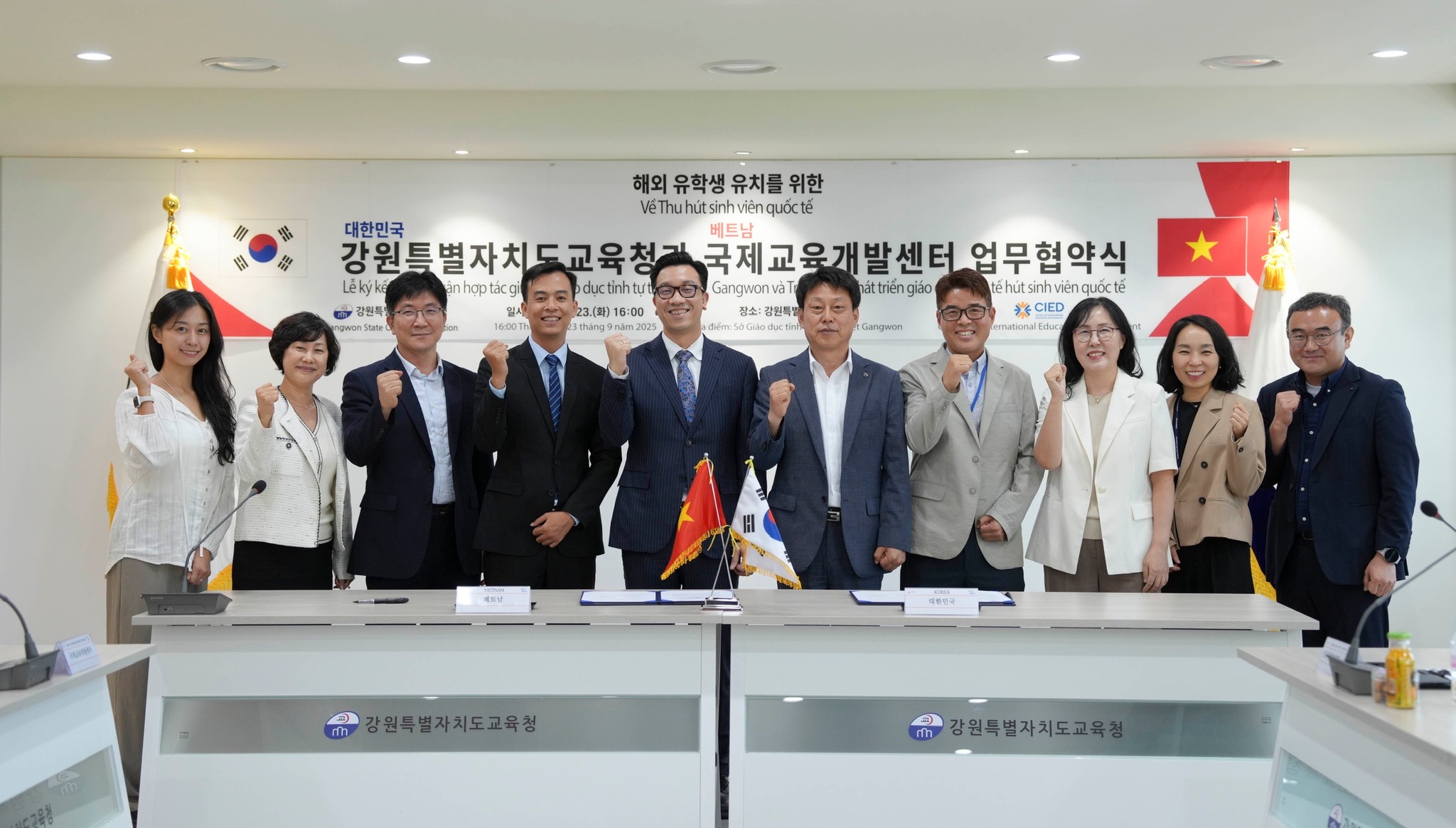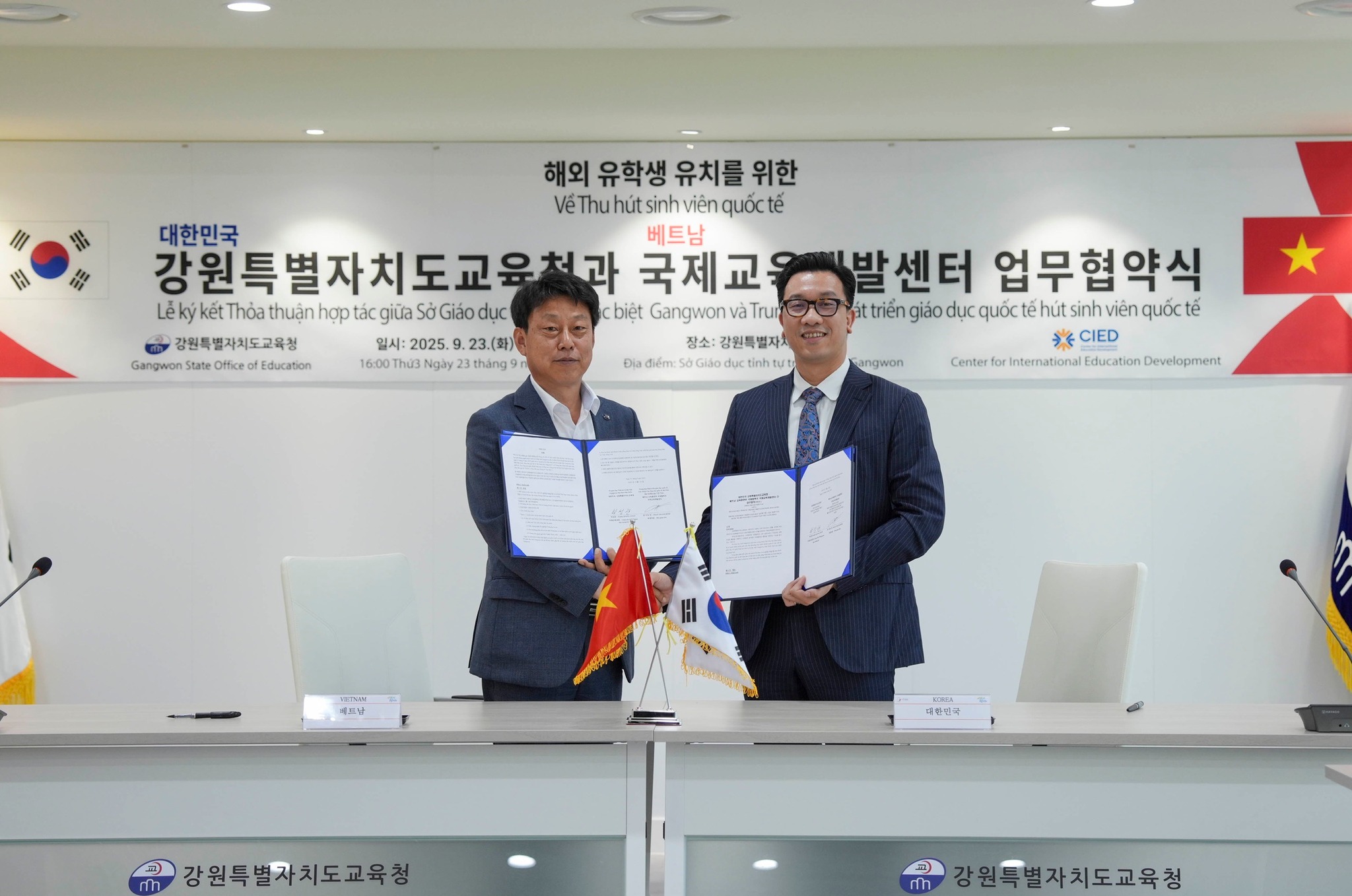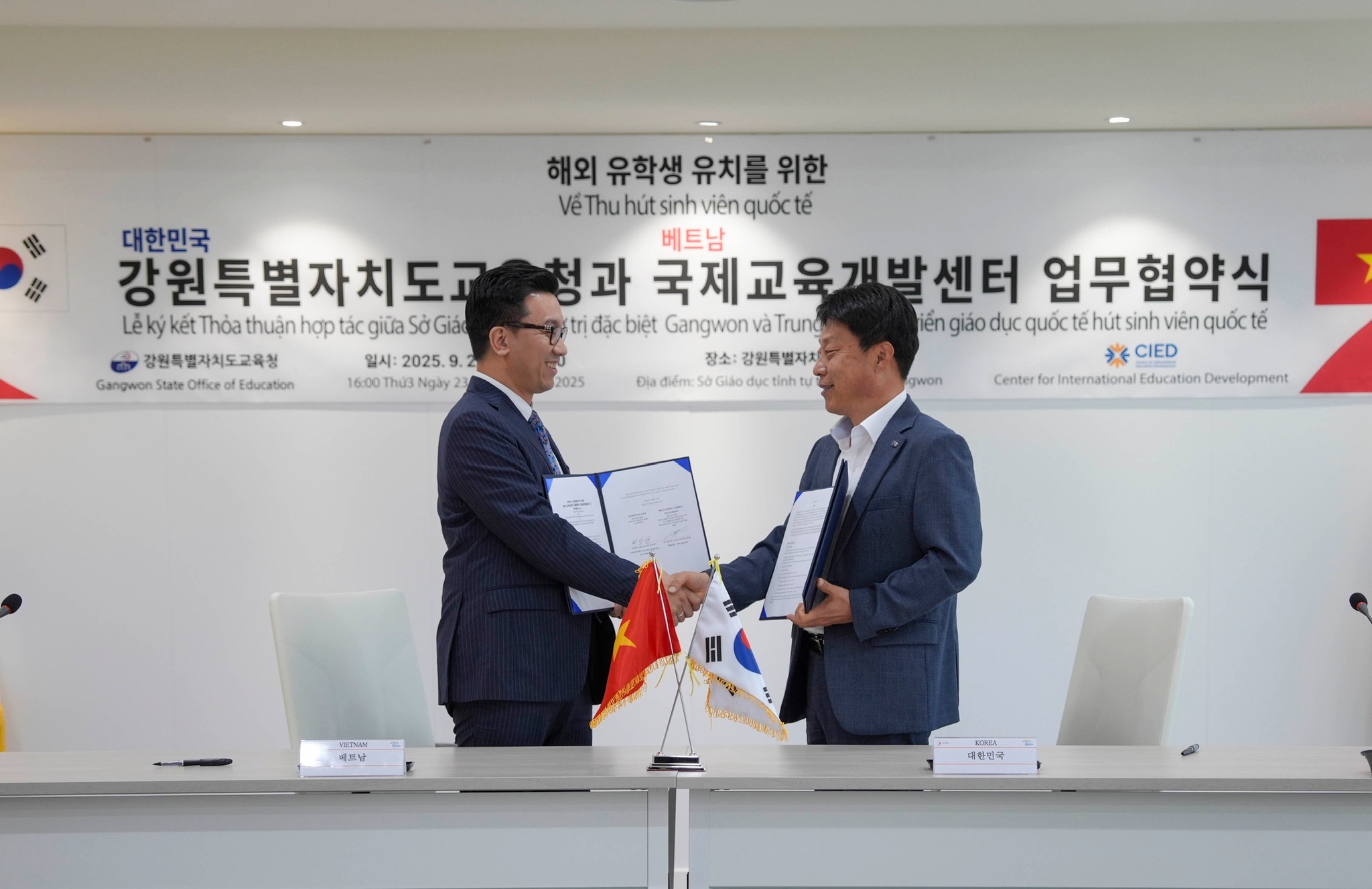 Hôm nay, ngày 23/9/2025, tại Văn phòng Sở Giáo dục Tỉnh tự trị đặc biệt Gangwon đã diễn ra lễ ký "Thỏa thuận hợp tác về việc thu hút sinh viên quốc tế" giữa Sở Giáo dục Tỉnh Tự trị đặc biệt Gangwon và Trung tâm Phát triển giáo dục quốc tế (CIED).